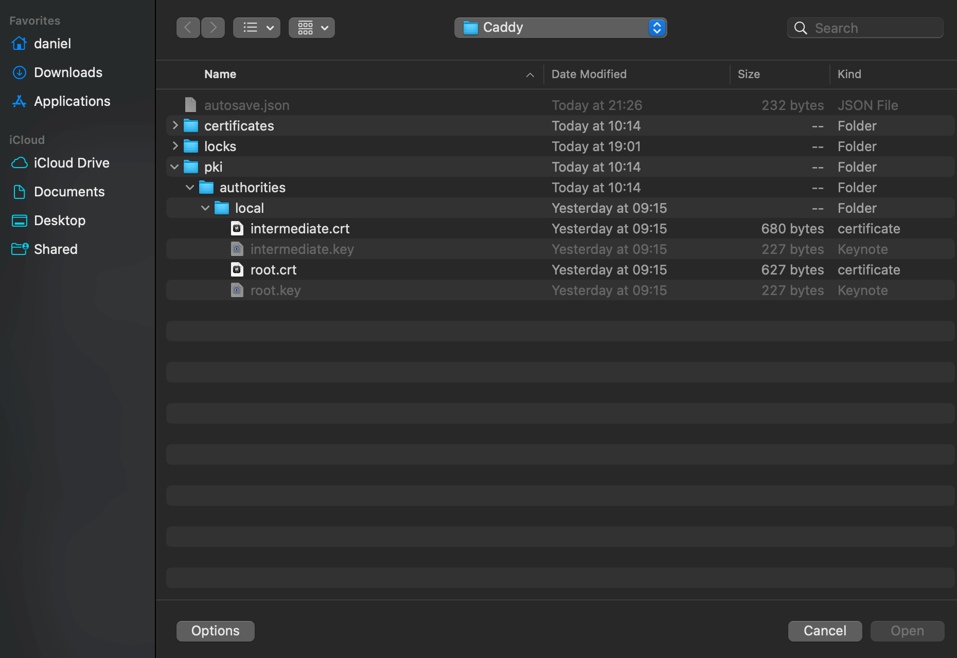 - Find Caddy’s local root certificate in its data directory, and open it. On a Mac it’s located at