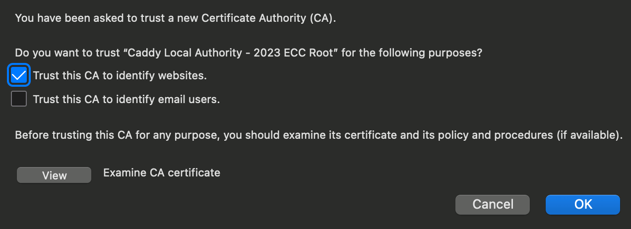 When running Caddy locally, it will also generate its own local Certificate Authority (CA). Caddy will use this CA to sign certificates for local HTTPS.