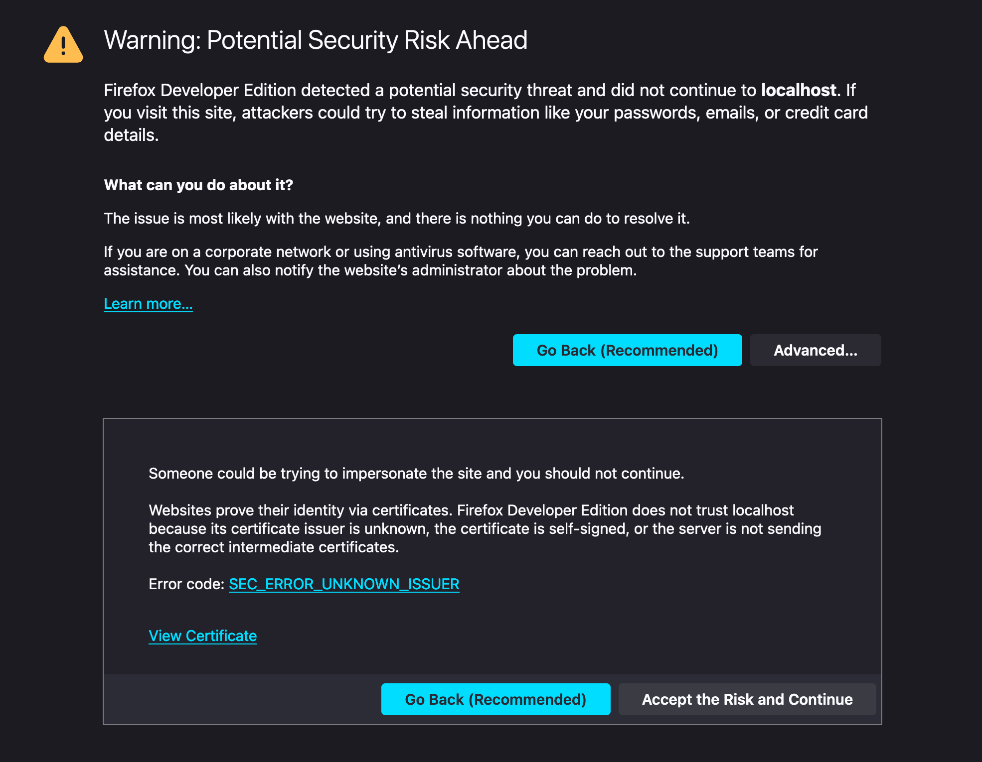 This is pretty cool! But Caddy’s local HTTPS does not work in Firefox by default. When running Caddy on localhost, Firefox will show the error code SEC_ERROR_UNKNOWN_ISSUER when visiting https://localhost (other browsers like Safari don’t have this issue).