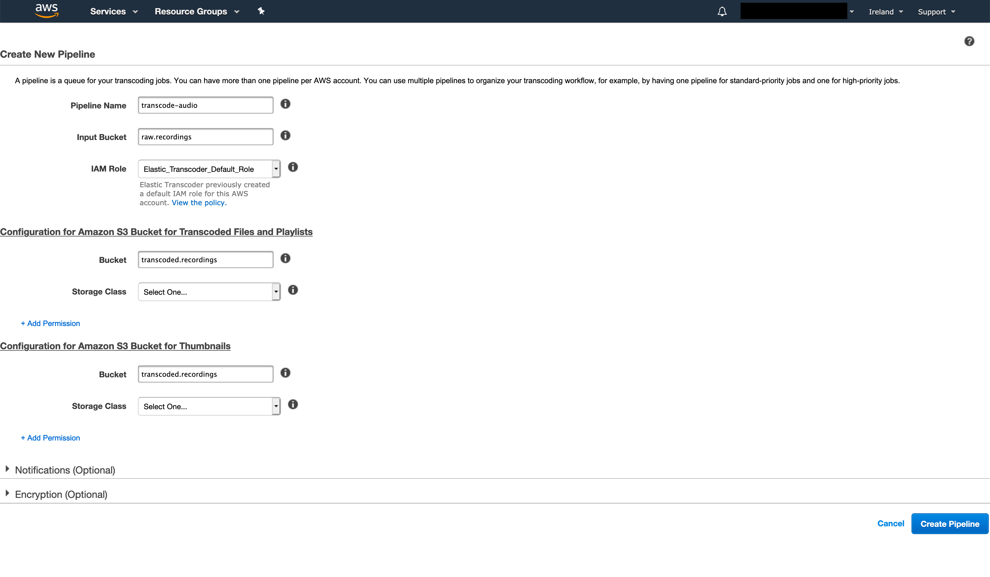 Navigate to the Elastic Transcoder service in the AWS web console. Select a region (we’ll use eu-west-1), and click on “Create New Pipeline”.