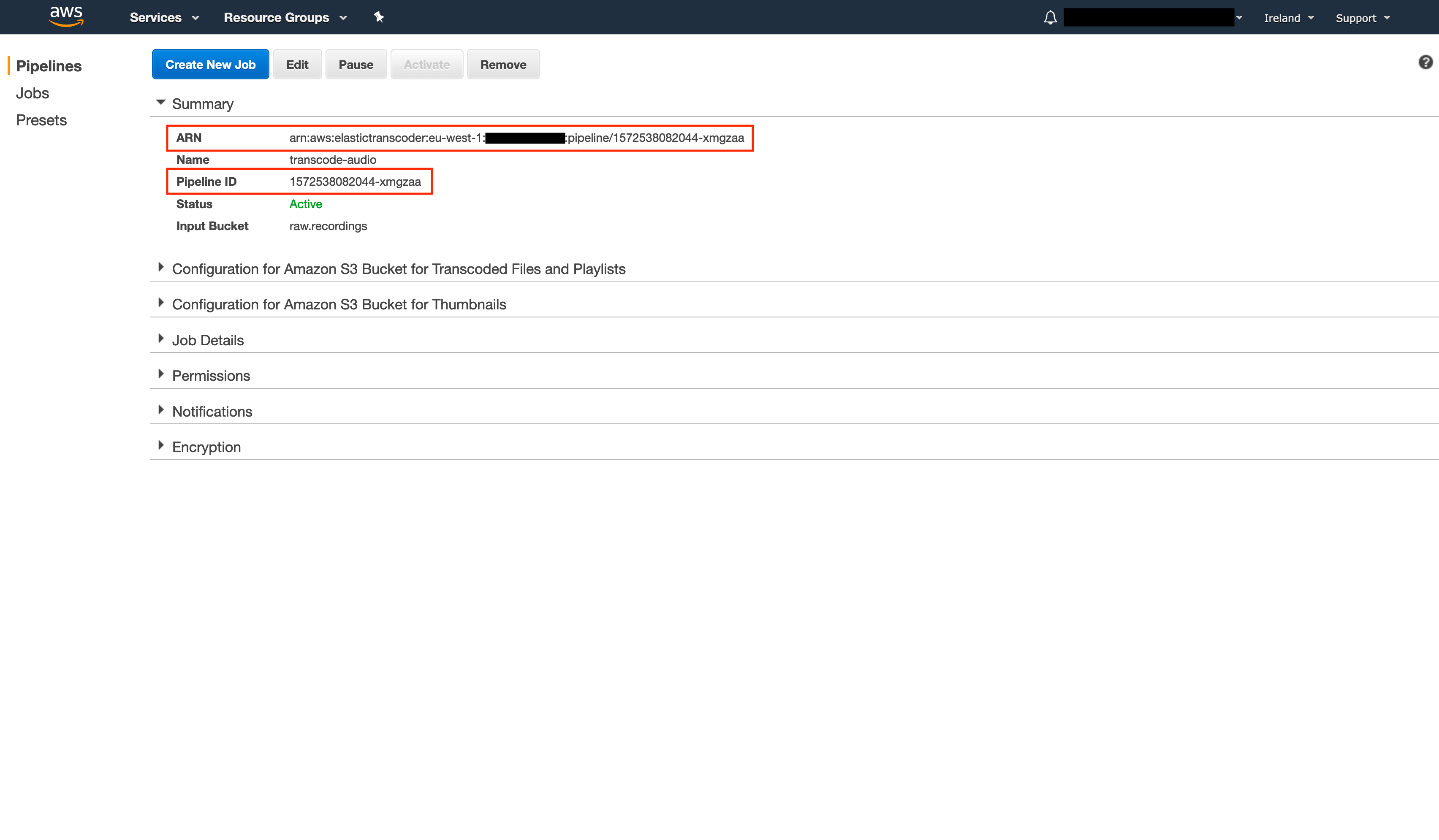 Create the pipeline and take note of the ARN and Pipeline ID. We’ll need both to configure the Lambda function later on.