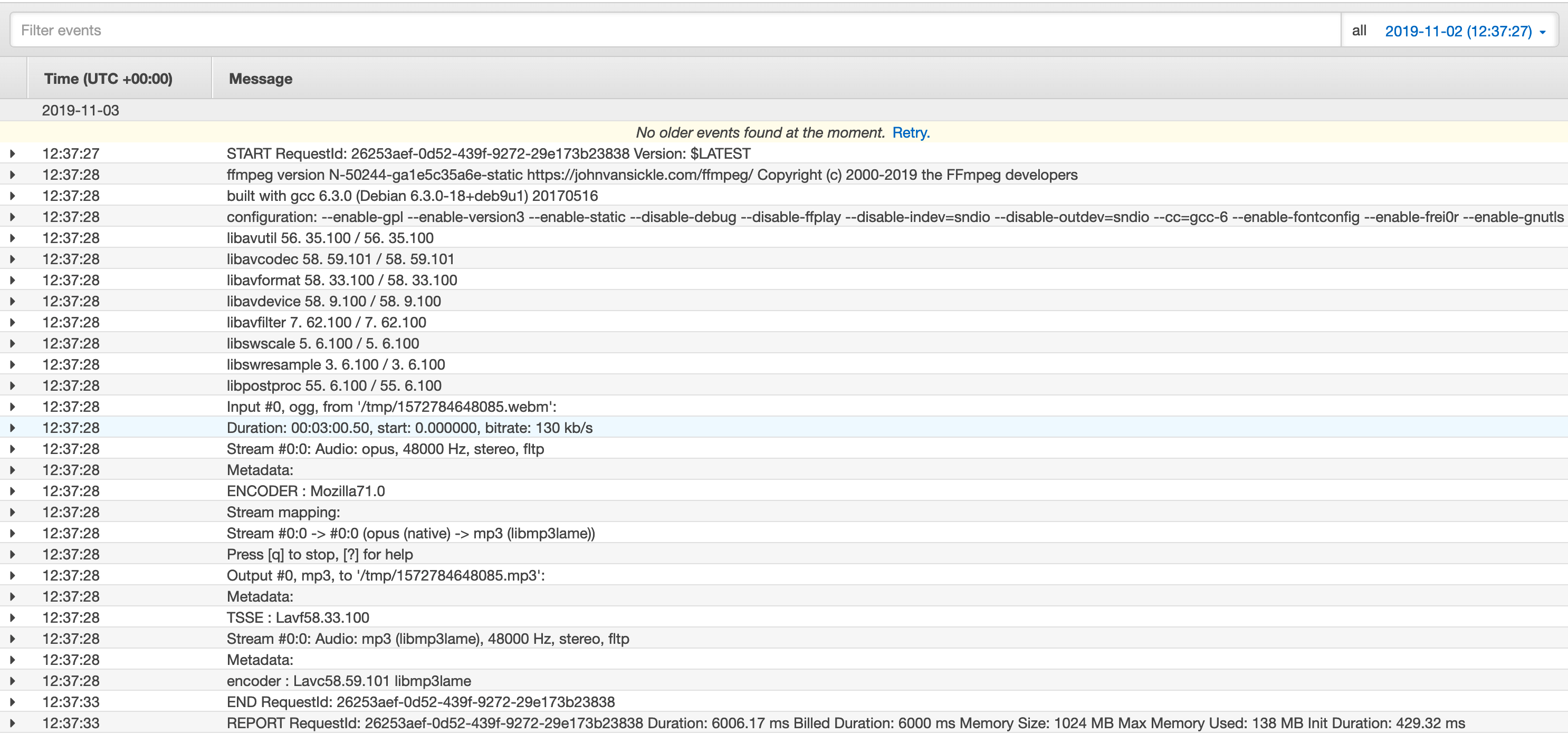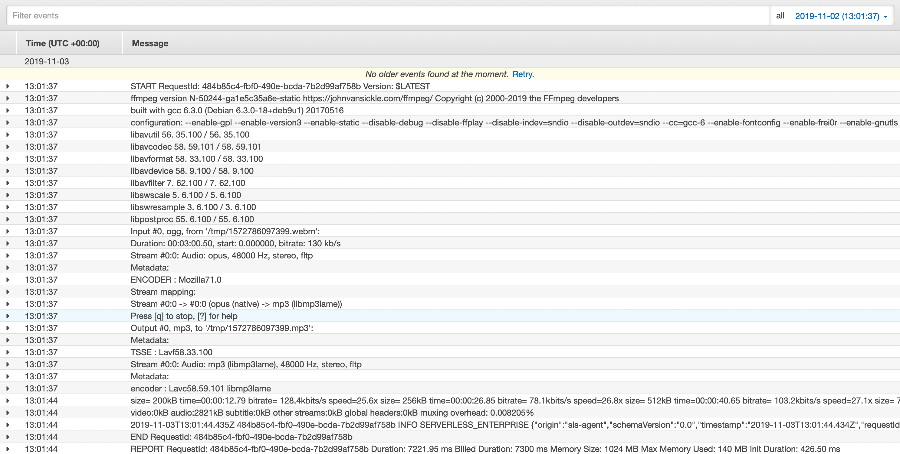 For a side project I’m converting WebM audio files to MP3. I initially started doing this with Amazon Elastic Transcoder. But after doing the same with FFmpeg and Lambda Layers, my initial testing showed that the latter is around 10 times cheaper and 2 times faster for short audio recordings (~3 minute / ~3 MB files).