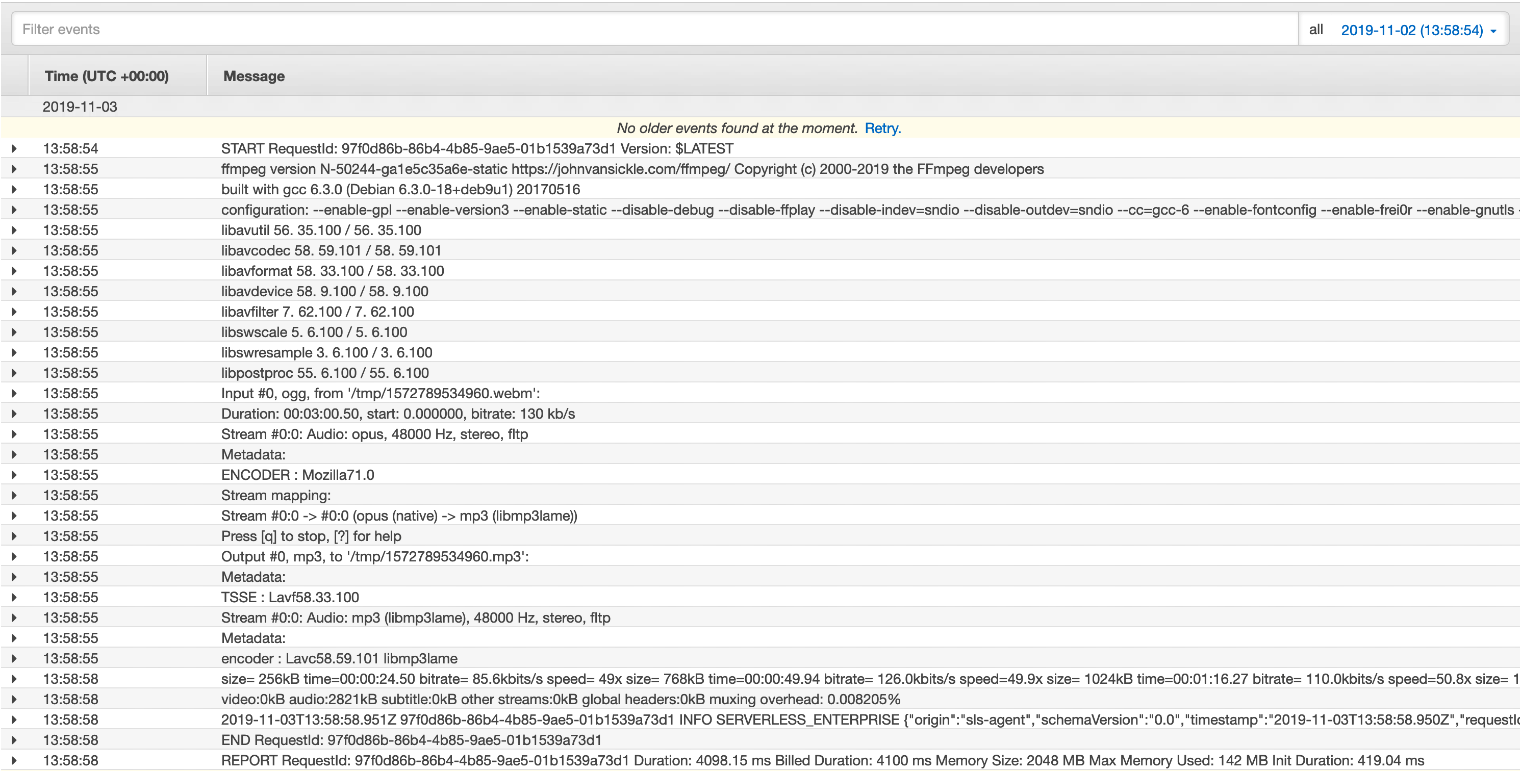 To compare costs between both implementation, I did a couple of test runs converting a 3 minute (2,8 MB) WebM audio file to MP3.