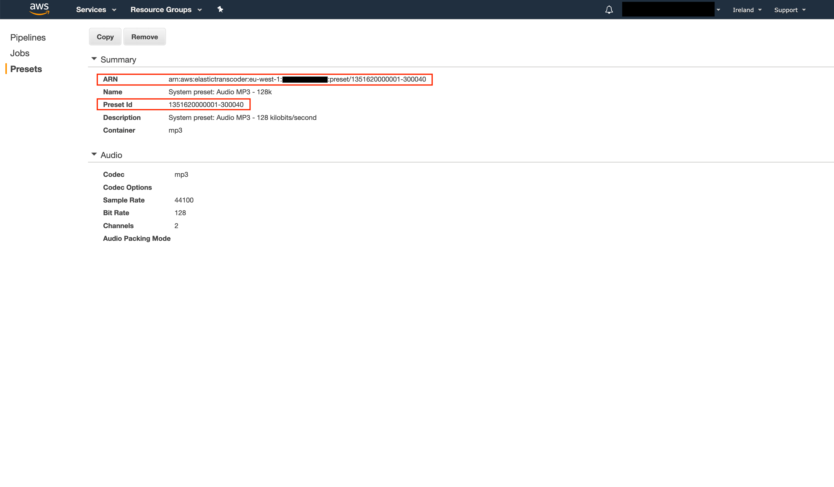 In the web console, click on “Presets” and filter on the keyword “MP3”. Select one and take note of its ARN and Preset ID. We’ll also need these to configure the Lambda function.