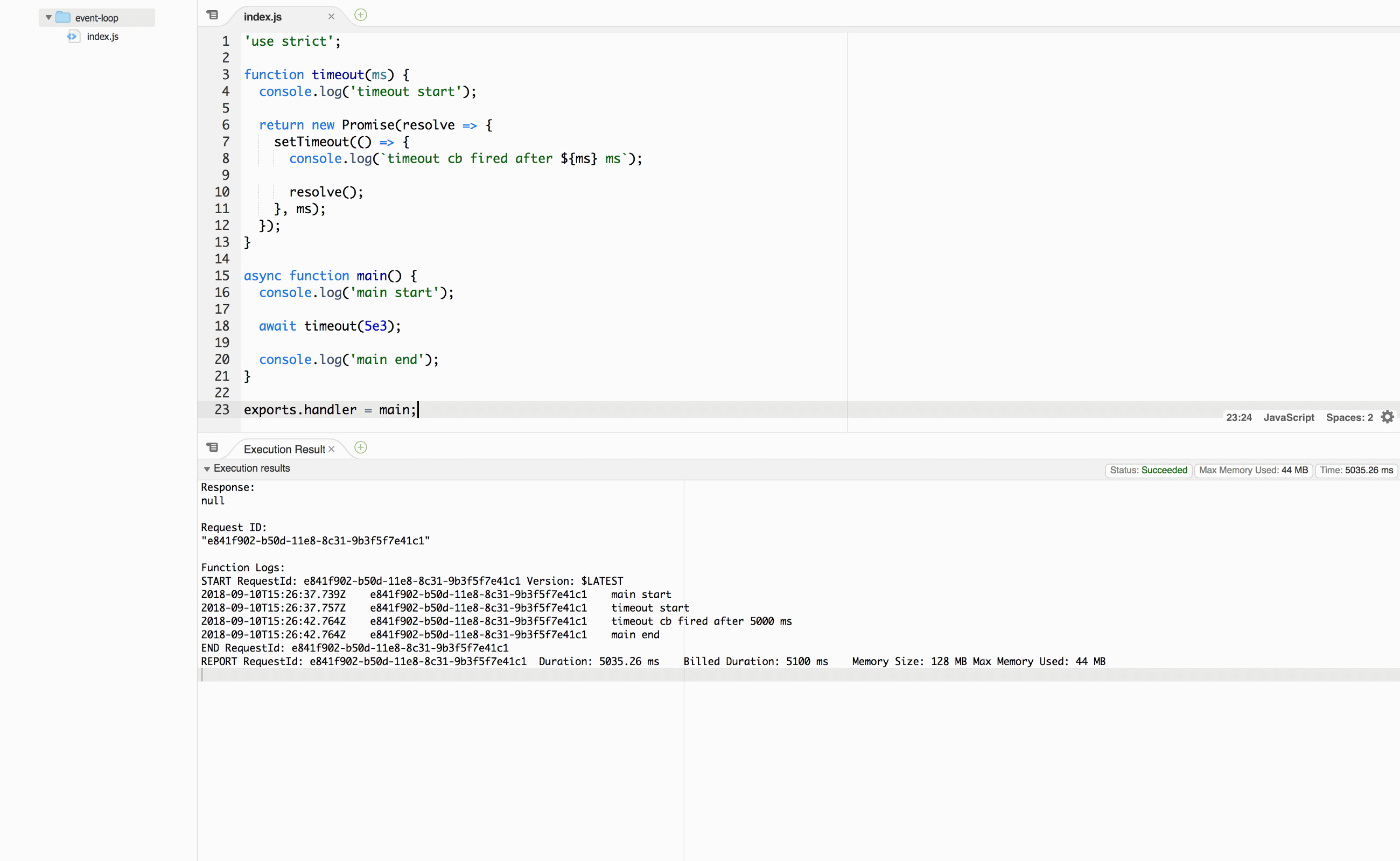 main()When we execute this script locally (not via Lambda) with node timeout.js, the following will print: