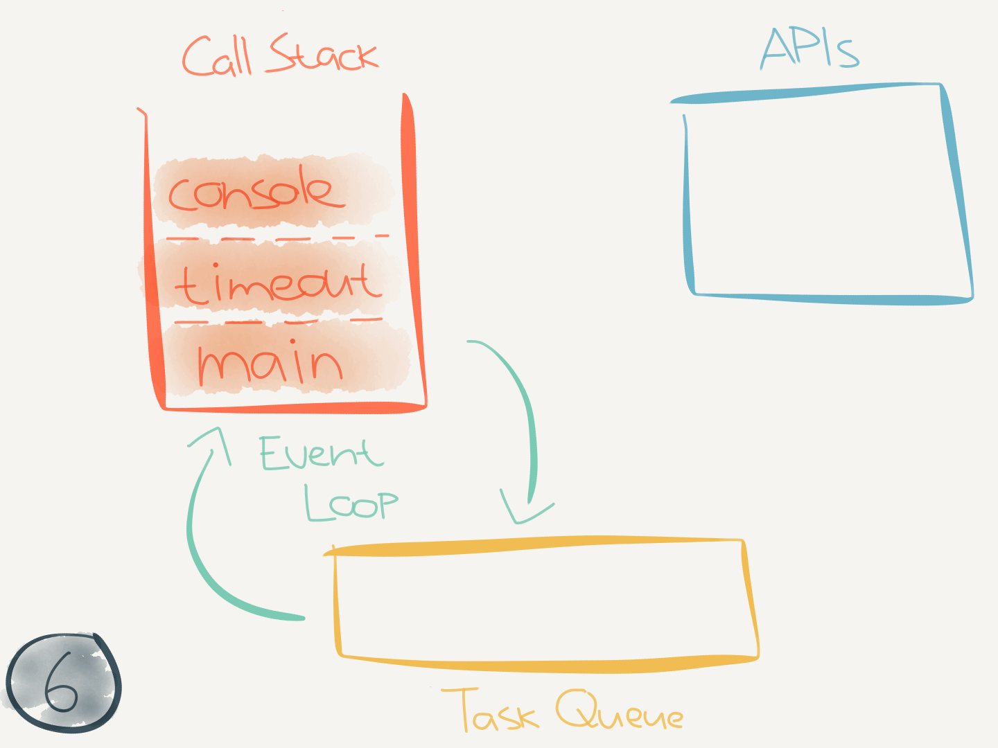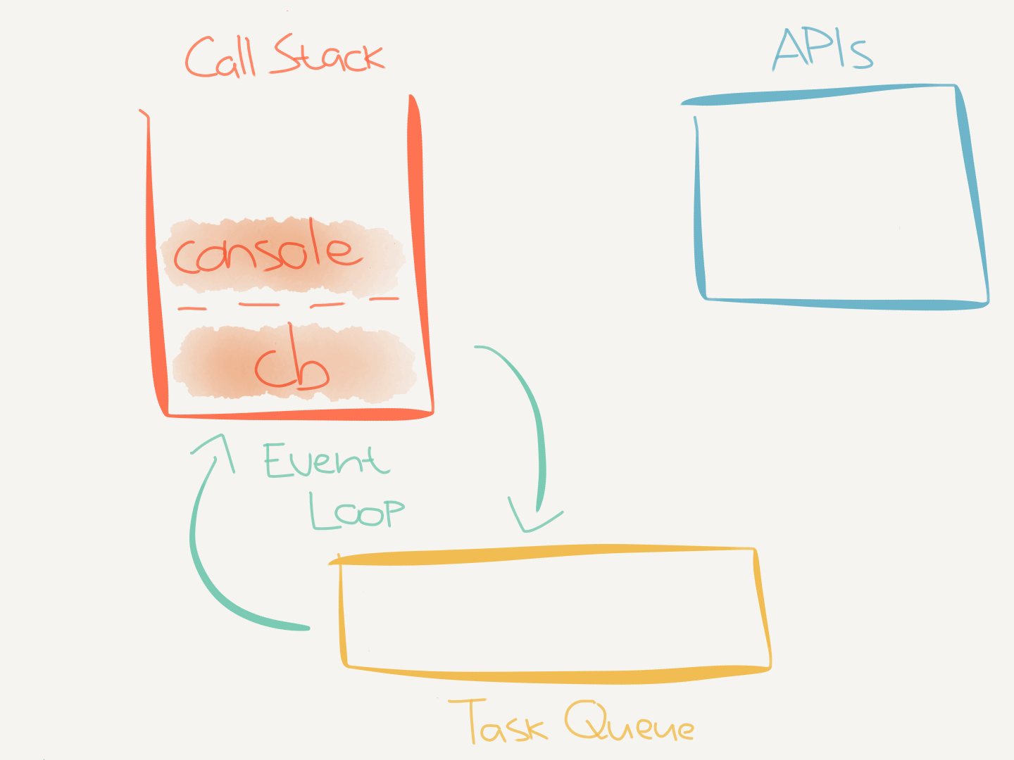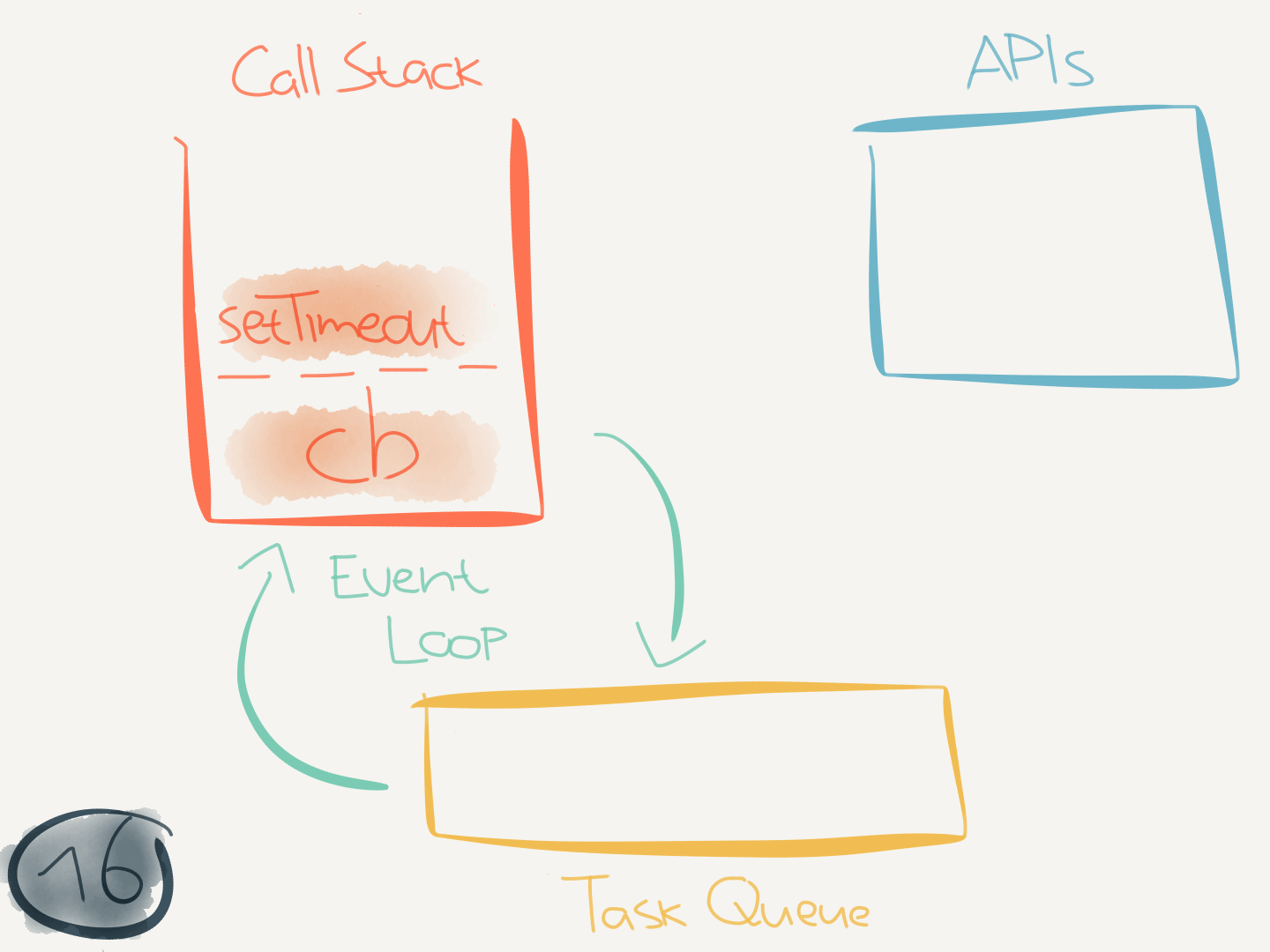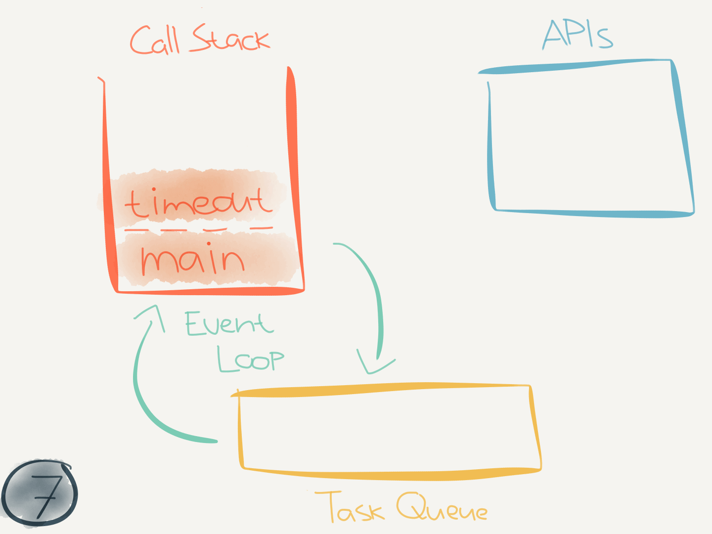 This code didn’t interact with any asynchronous (internal) APIs. But when it does (like when calling setTimeout(callback)) it makes use of the task queue.