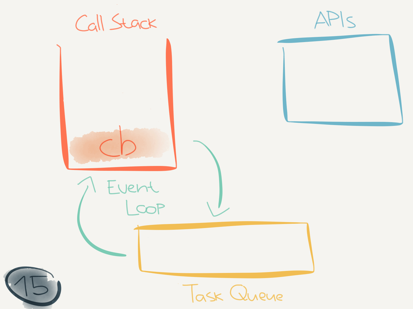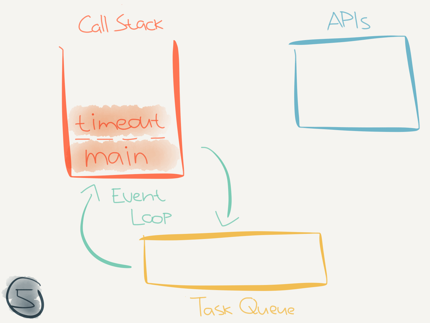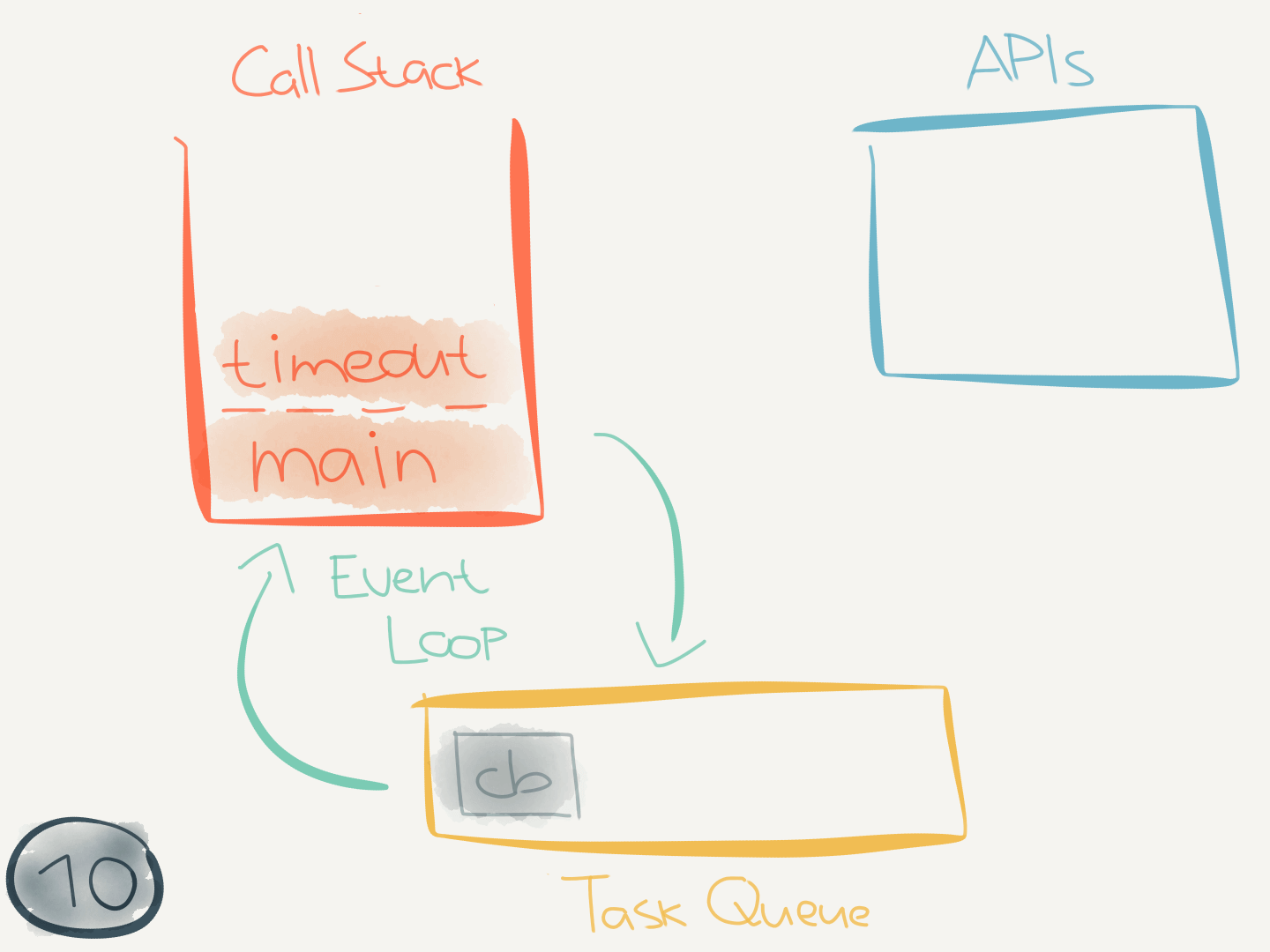 This code didn’t interact with any asynchronous (internal) APIs. But when it does (like when calling setTimeout(callback)) it makes use of the task queue.