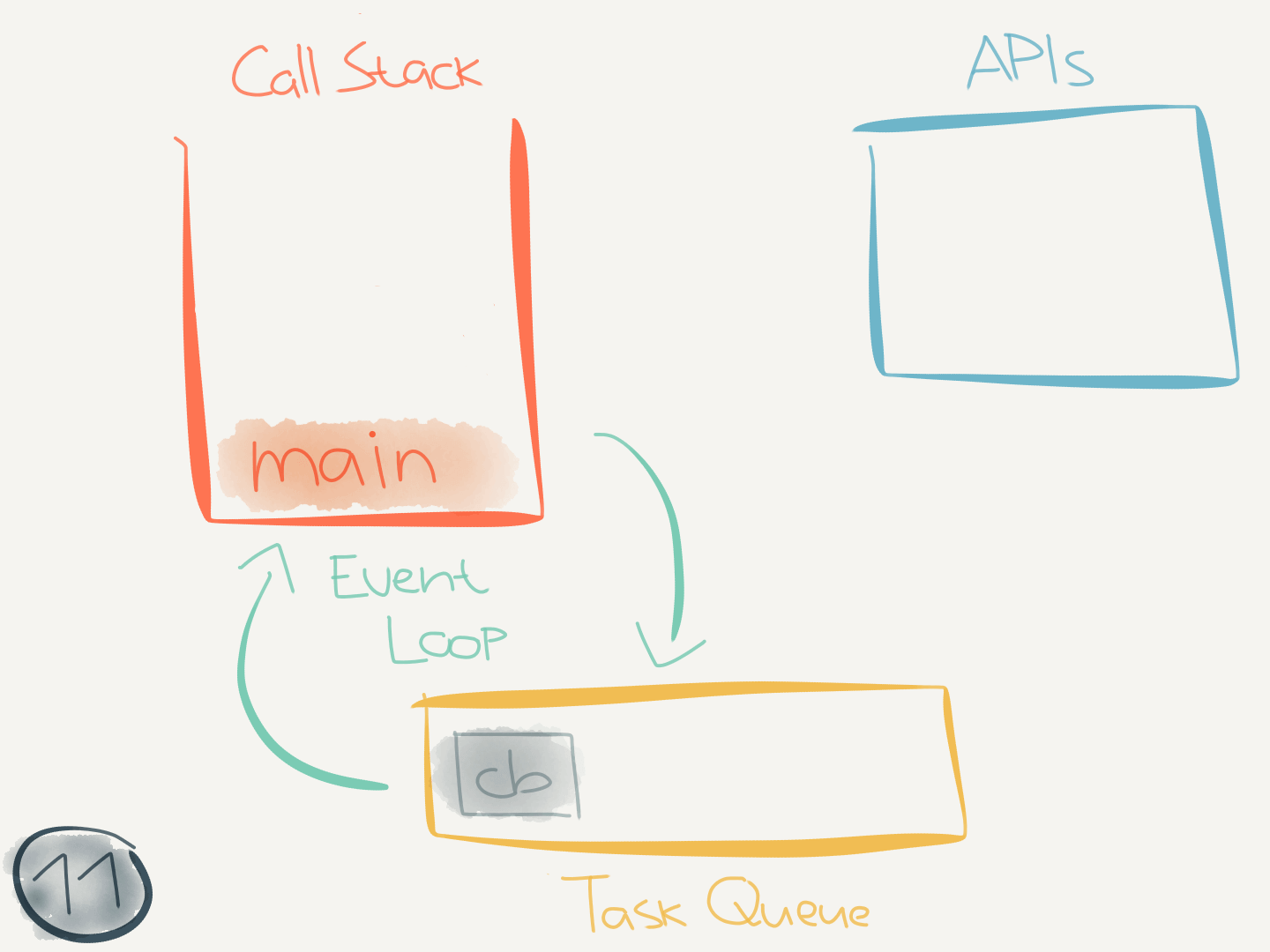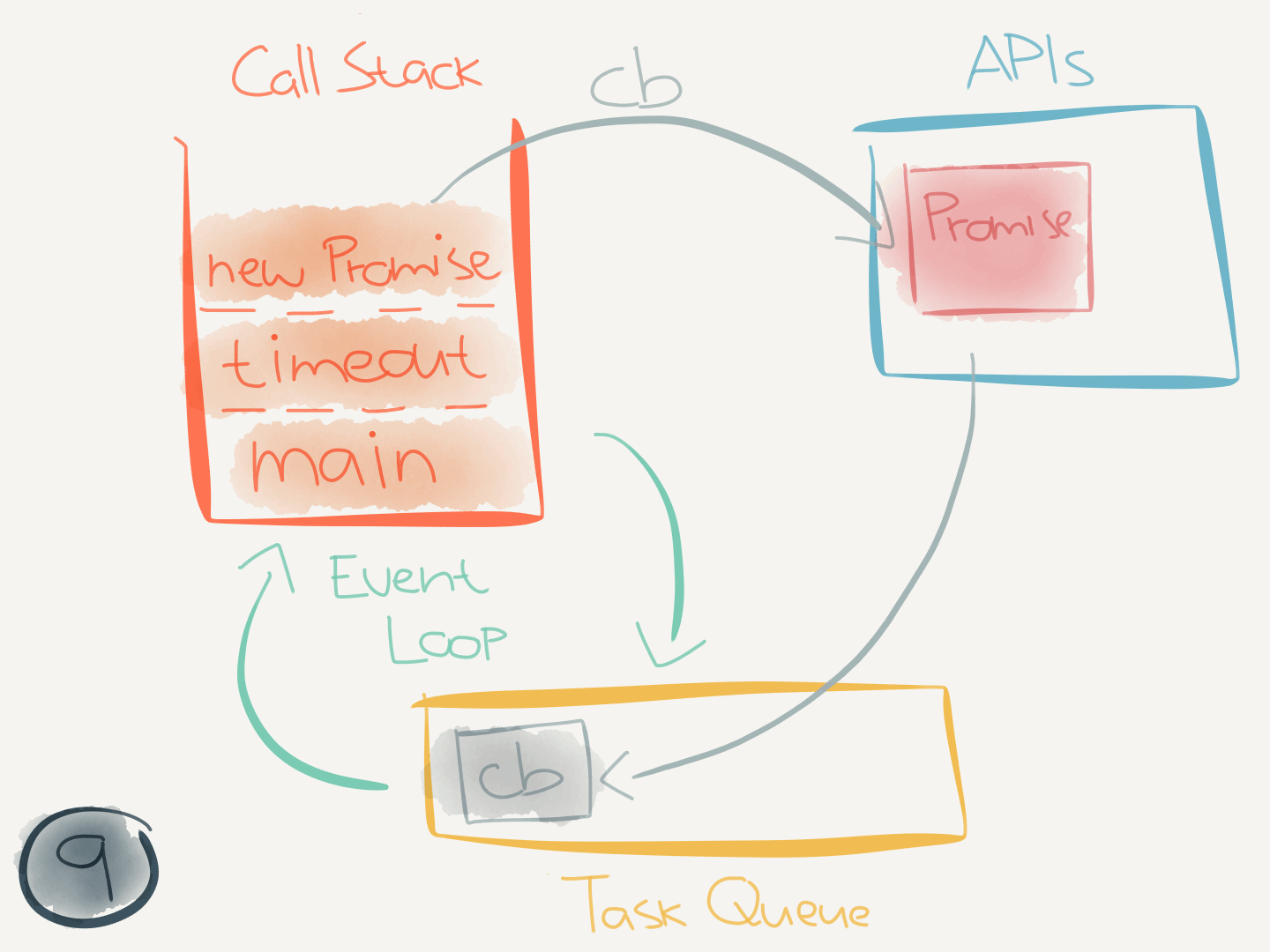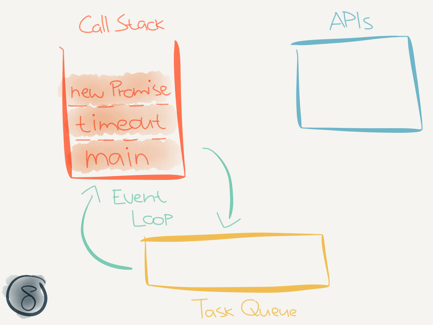new Promise(callback)executes, it interacts with thePromiseAPI and passes the provided callback to it. ThePromiseAPI sends the callback to the task queue and now must wait until the call stack is empty before it can execute.