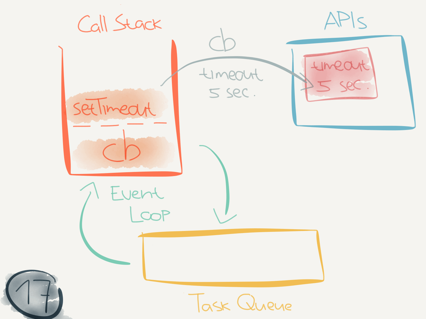 setTimeout(callback, timeout)finishes executing and is popped of the call stack. At the same time thesetTimeoutAPI starts counting down the timeout, to schedule the callback function in the future.